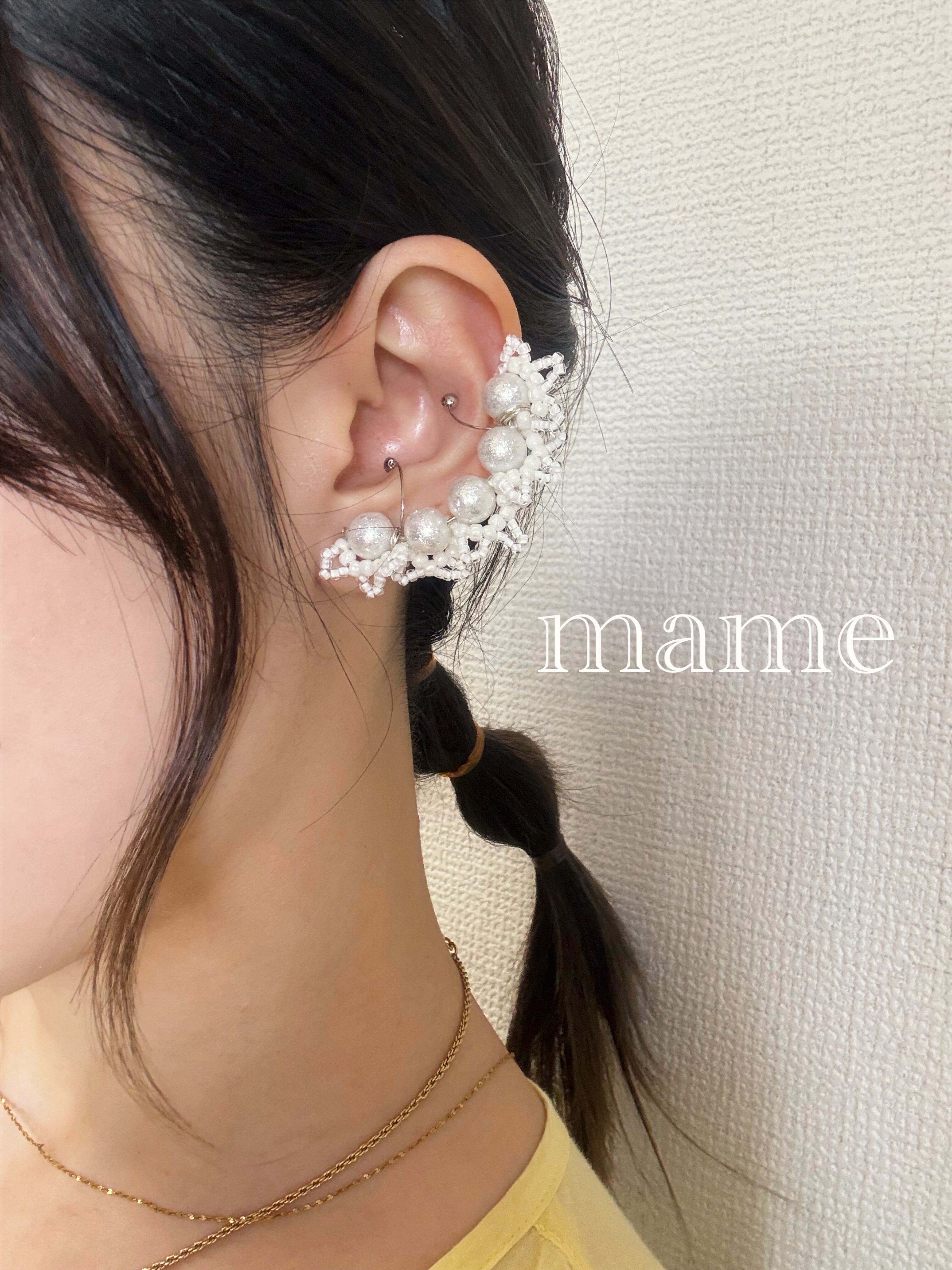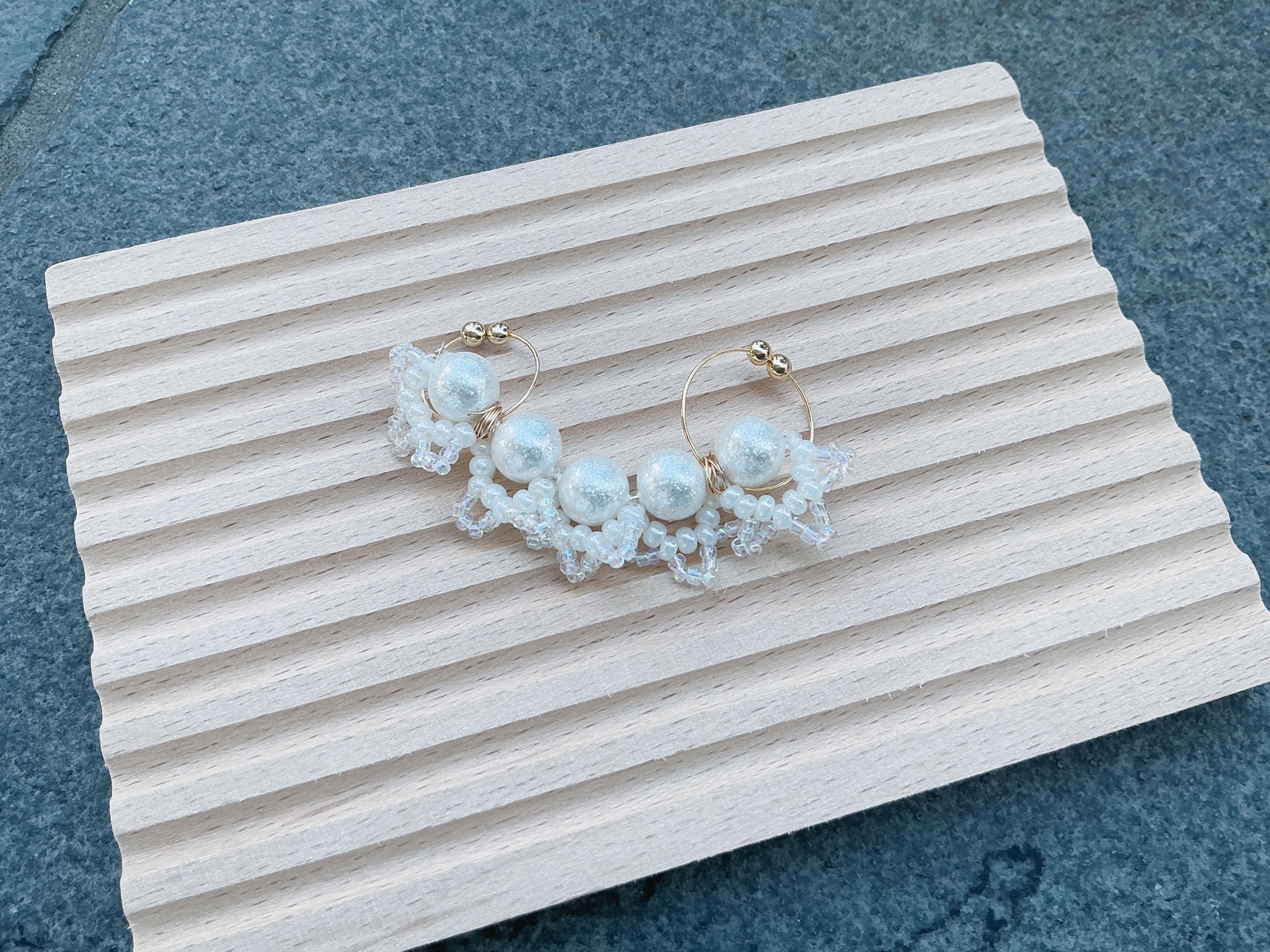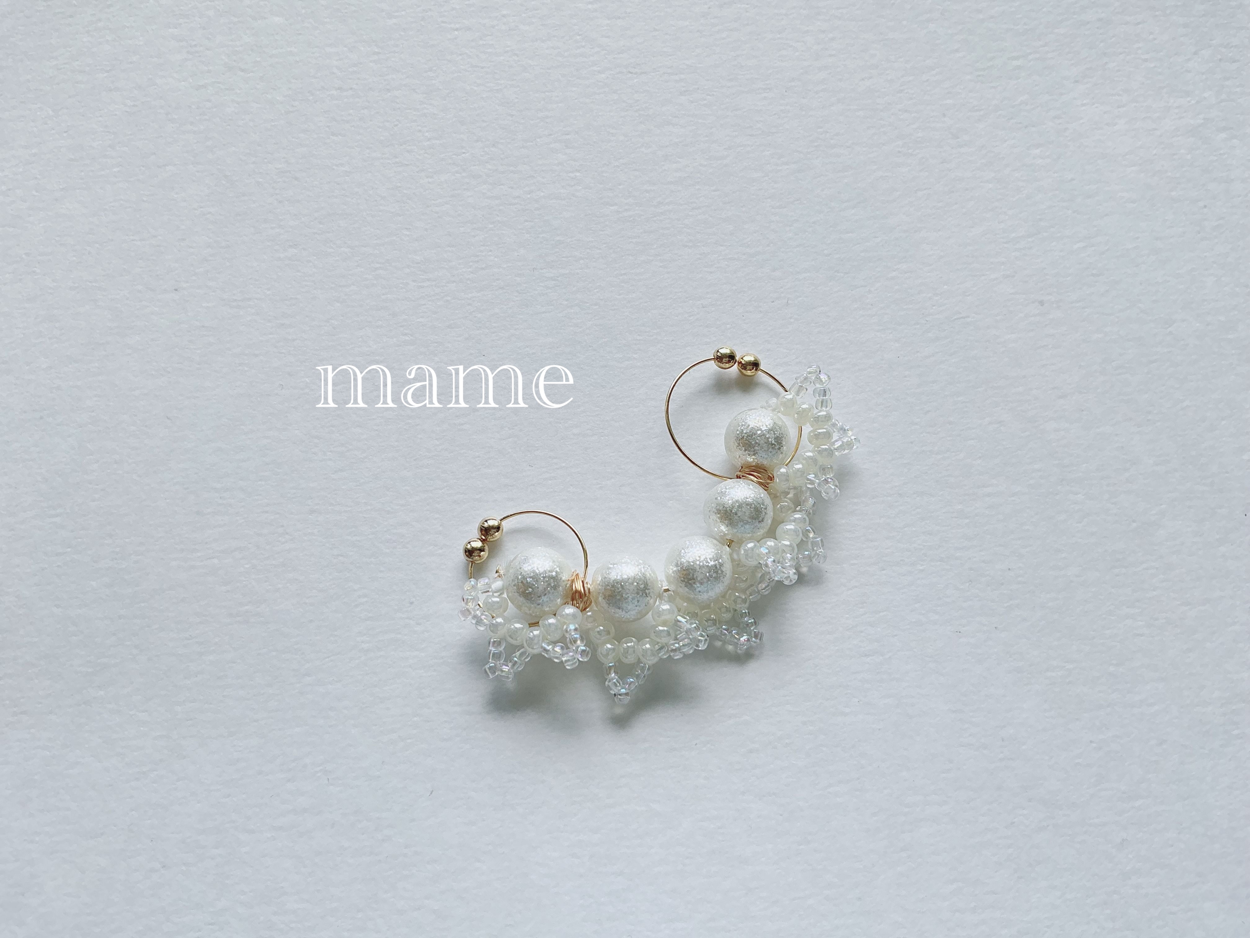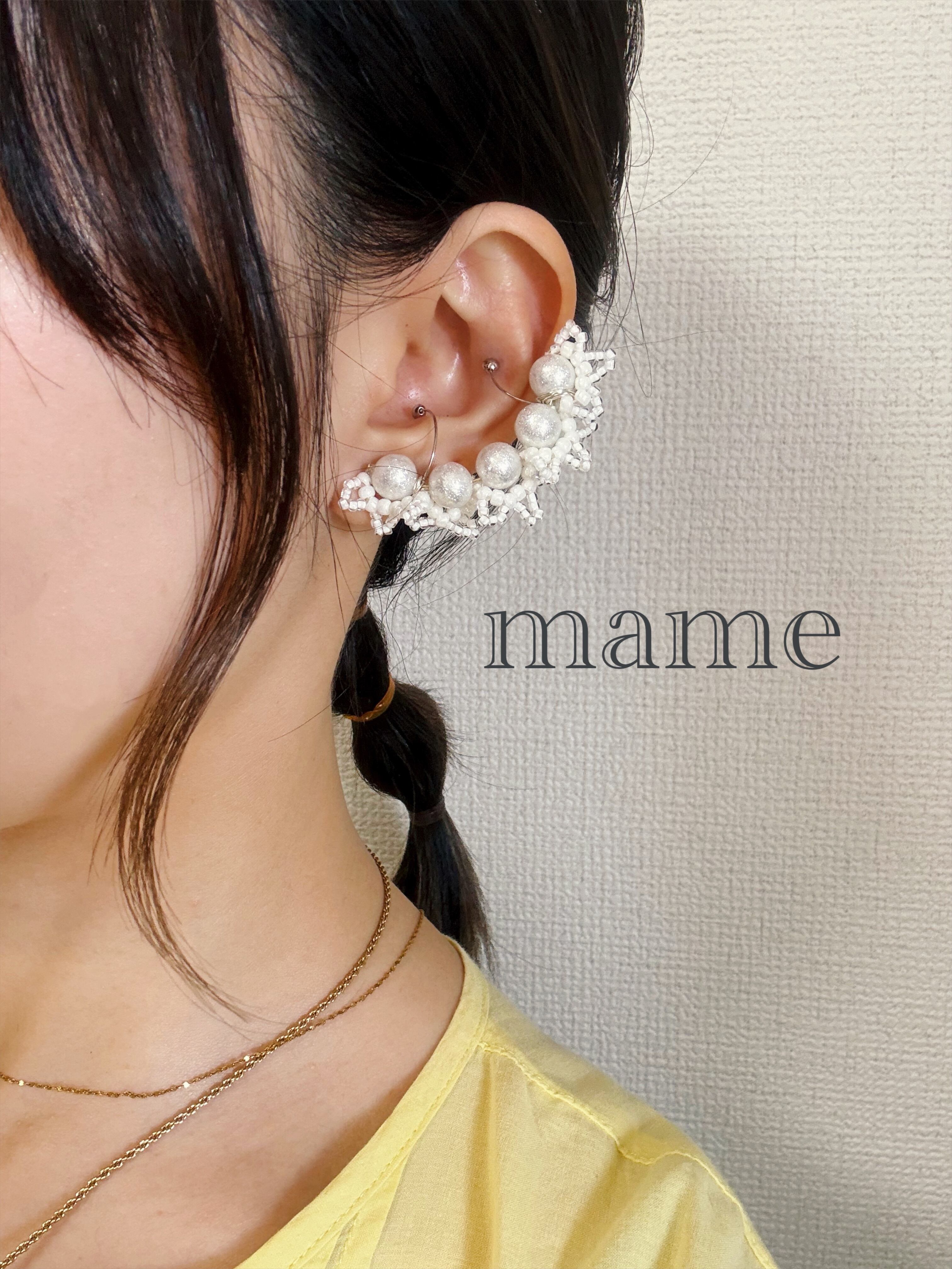 パールの片面にビーズでレースを編み込んで、イヤーカフにしてみました*